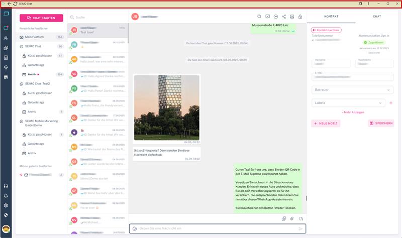 ⇒ Das Browserfenster öffnet den SEIMO Chat ohne Adresszeile, ohne Tabs und Lesezeichenleiste.