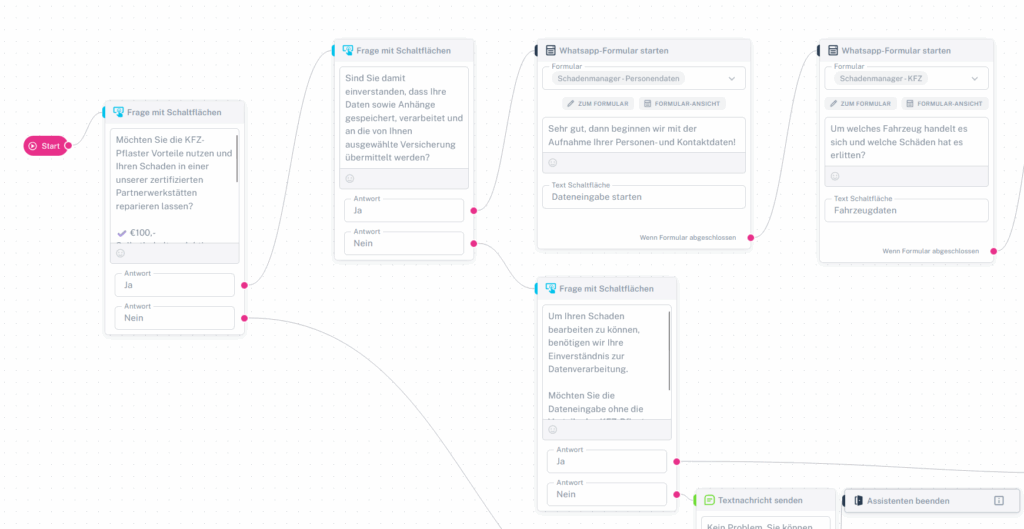 - Nehmen Sie nun noch die entsprechenden Adaptierungen vor. Sie brauchen dazu nur jenen Assistenten auswählen, der dem Kunden angeboten wird, wenn er sich NICHT für den Schaden-Manager.com Prozess entschieden hat. Im Falle des Haushalts-Pflasters können Sie z.B. den vorgefertigten Assistenten „Schaden Haushalt-Eigenheim“ integrieren. Dieser ist im Shop kostenfrei zu erwerben. Im Falle des KFZ-Pflaster gehen Sie gleich vor.