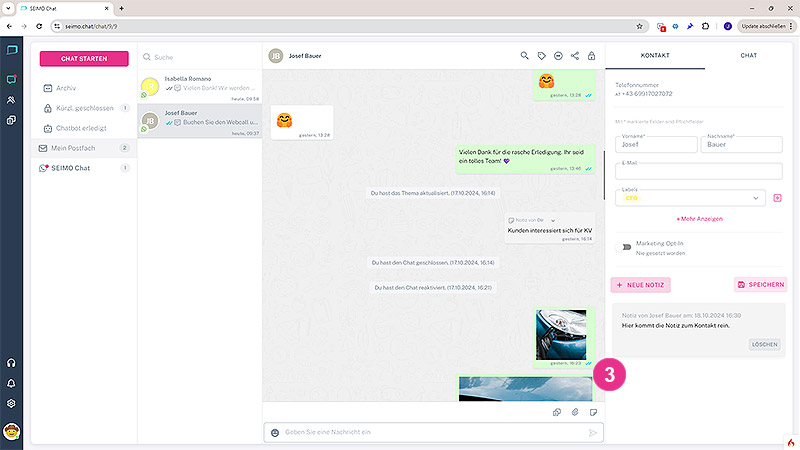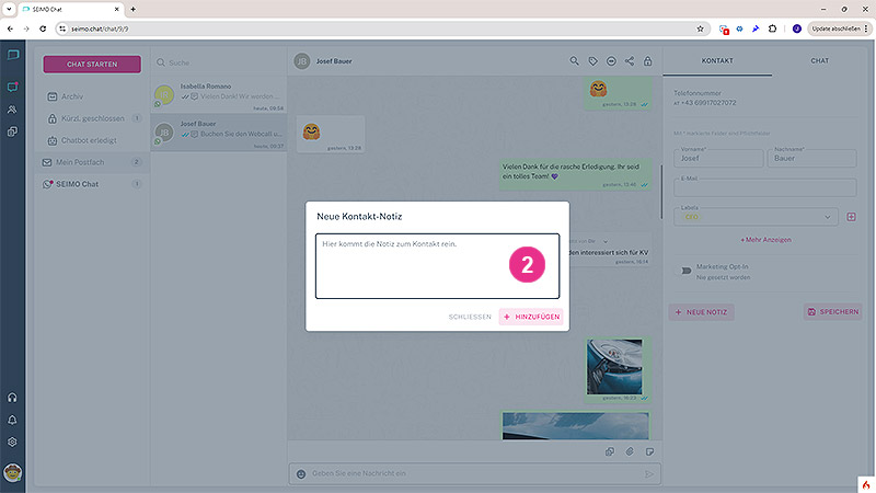 3. Sie sehen nun die Notiz im Chatfenster und auch in der rechten Spalte in der Rubrik Notizen. Sie können die Notizen dort bearbeiten oder löschen.